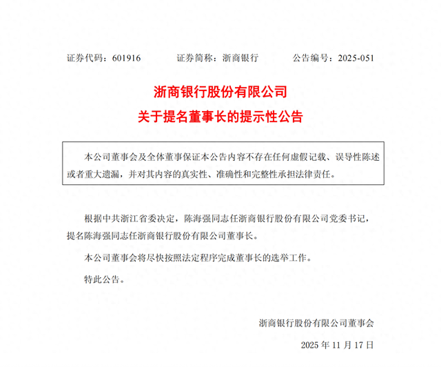 11月17日,浙商银行(601916.SH)公告称,根据中共浙江省委决定,陈海强任浙商银行股份有限公司党委书记,提名陈海强任浙商银行股份有限公司董事长。浙商银行董事会将尽快按照法定程序完成董事长的选举工作。